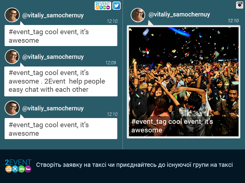 {2Event} «Chat para um projetor» funciona com o mesmo princípio que o SMS-chat do canal de TV. No entanto, a vantagem disso está em conexão com o público do evento. Além das mensagens enviadas a partir do aplicativo, trazemos para o nosso chat mensagens retiradas do Twitter e Instagram que contém #hashtag de seu evento. Parece assim veja o exemplo: {https://2event.com}/events/comments/200640